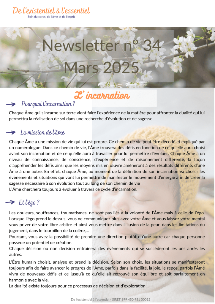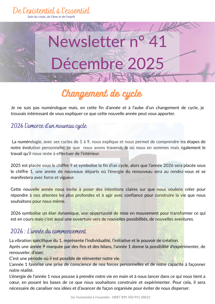 Cet atelier fait suite à l’atelier de décembre. Après avoir nettoyé et vidé, il faut ensuite se recharger et remplacer les limitations et peurs par de nouvelles énergies en phase avec ce que vous souhaitez entreprendre à partir de 2026 (intégration et activation des énergies pour l’année 1).