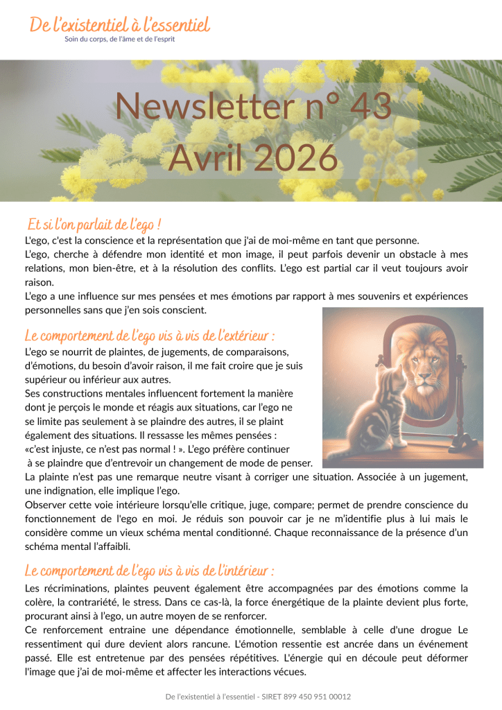 Prendre conscience de la perception et la représentation que j’ai de moi-même en tant que personne. Observer le fonctionnement de l’ego pour prendre conscience des chemins souvent illusoires qu’il veut nous faire emprunter.
